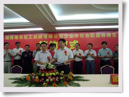 10月10日,湖南湘東化工機(jī)械有限公司企業(yè)辦社會(huì)職能移交攸縣人民政府簽約儀式在海悅國(guó)際大酒店舉行。會(huì)議由省石化行業(yè)管理辦公室主持,省石化行業(yè)管理辦公室副主任方忠、改制辦處長(zhǎng)唐輝島,株洲市勞動(dòng)局副局長(zhǎng)李國(guó)華,湘東化機(jī)董事長(zhǎng)兼總經(jīng)理蘇成、黨委書(shū)記林德晁、副總經(jīng)理姜衡陽(yáng)、副總師兼改制辦主任陽(yáng)炳伏,攸縣縣委書(shū)記鄺鄒飛,攸縣縣委副書(shū)記、縣長(zhǎng)胡湘之,攸縣各職能部門(mén)領(lǐng)導(dǎo)出席了會(huì)議。